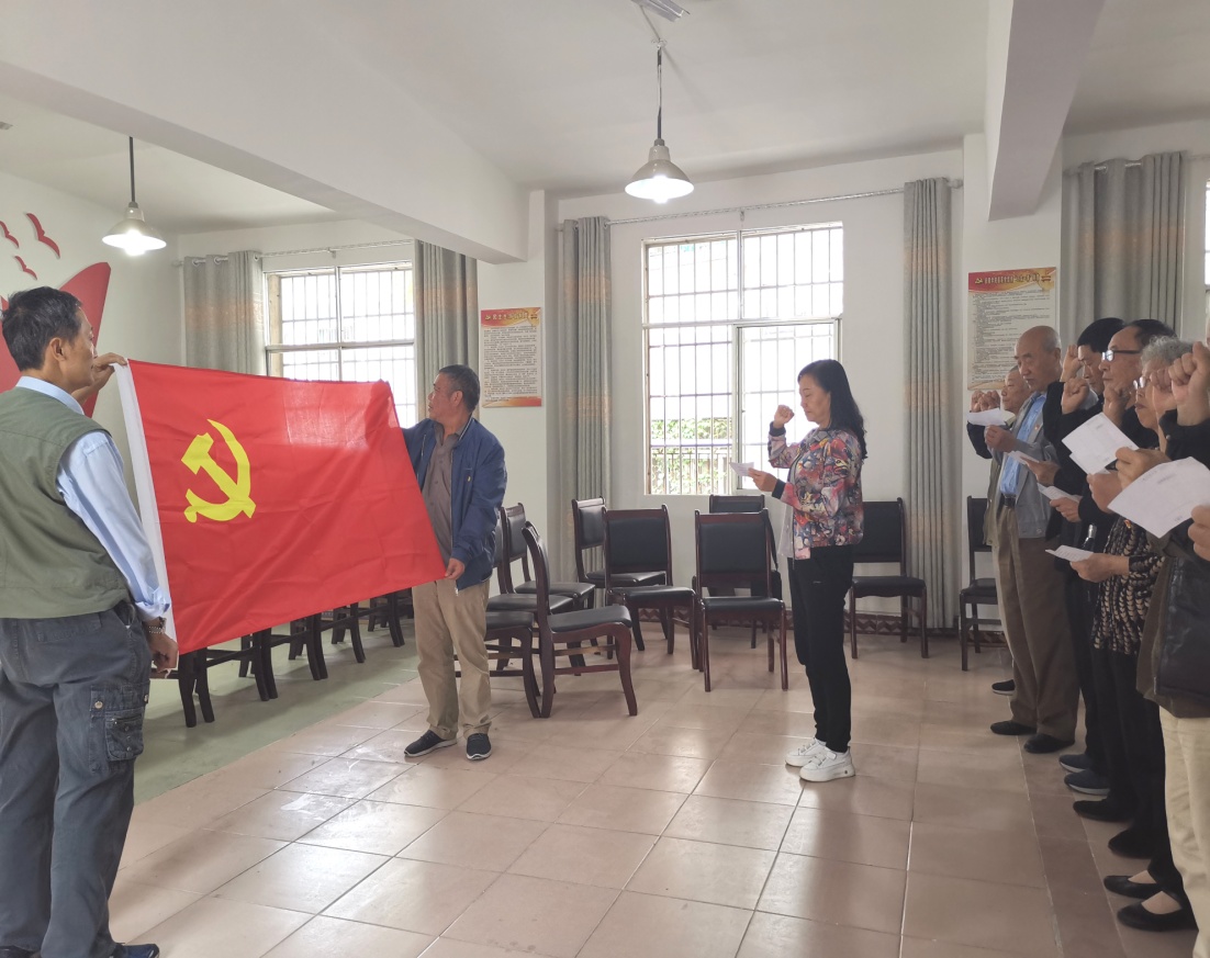 老党员们在党委书记刘颖的带领下,面对鲜红的党旗,庄严地举起右手,一字一句铿锵有力,满怀激情地重温了入党誓词。